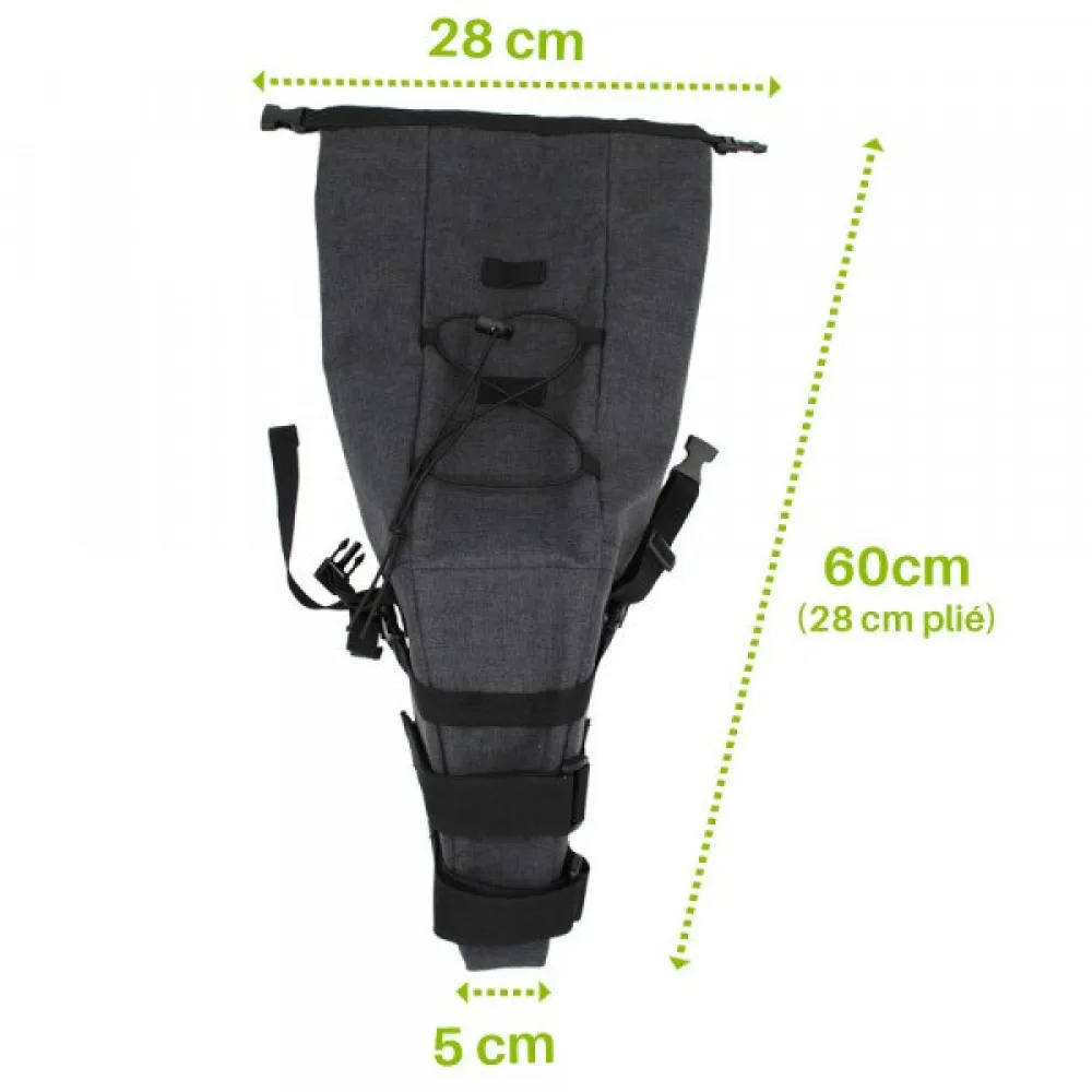 Esta bolsa de sillín de 22x50x15 cm es resistente al agua. Es la más grande de su clase y ofrece un gran espacio de almacenamiento (15L). Es ideal para llevar un kit de reparación de bicicletas, llaves, teléfono, k-way o una botella de agua grande. La funda Bike tiene un cierre enrollable con velcro y hebilla. En el exterior hay una correa elástica para una prenda adicional. La funda para bicicleta es fácil de colocar gracias a sus 4 correas adaptables a cualquier sillín de bicicleta. La bolsa será útil para todos aquellos a los que les guste salir a pasear, así como para los desplazamientos cortos cotidianos.