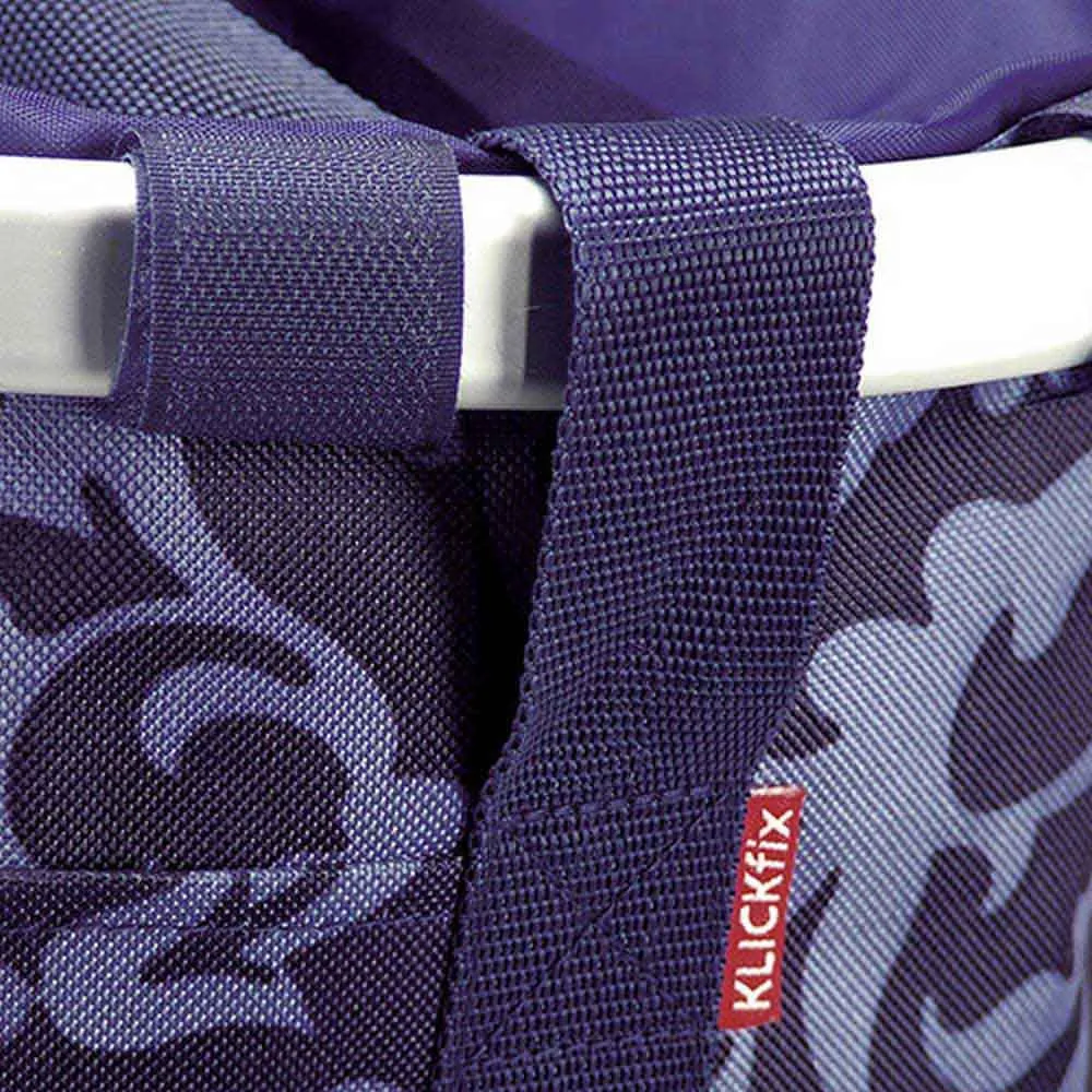 El resultado de una cooperación entre dos marcas líderes. la elegante cesta de tela reisenthel tiene un marco de aluminio exclusivo con acoplamiento klickfix. un excelente compañero de compras dentro y fuera de la bicicleta. canasta de tela con bolsa en la parte delantera, compartimento interior con cremallera, compartimento para teléfono móvil, abertura con cordón y bolsa multiusos desmontable. disponible en varios diseños; hecho de poliéster resistente y plegable. el marco de aluminio ligero se combina con un acoplamiento klickfix para el adaptador del manillar.