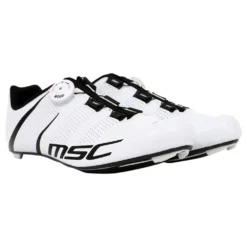 Zapatillas Msc Road Pro Color Blanco, Para El Ciclista De Carretera Que Busca Máxima Ligereza, Comodidad Y Rendimiento En Cada Salida – Talla 44 – Ventilación En Los Dos Costados – Suela De Carbono Con Ventilación, Rígida Y Ligera – Cubierta En Poliéster, Diseño Minimalista Para Reducir El Peso – Sistema De Cierre Con Rulina Atop, Para Un Ajuste Totalmente Personalizado – Detalles De Msc En La Parte Lateral.
