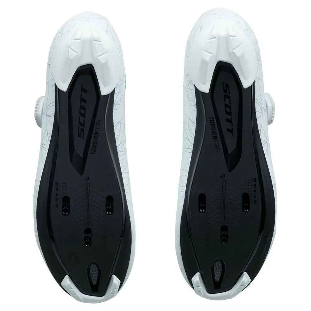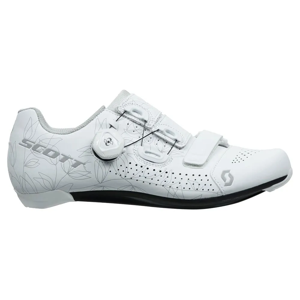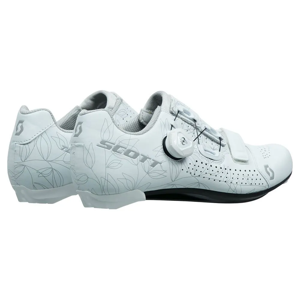 El calzado para mujer Scott Road Team Boa® está diseñado específicamente para mujeres, con un índice de rigidez de 8. El calzado cuenta con una parte superior de microfibra elegante y asimétrica y un patrón de ajuste adaptable ajustado con un sistema de ajuste Boa Ip1 en la parte superior. . Combinado con una correa de ajuste anatómico inferior, se articula para adaptarse mejor a la forma del pie del ciclista. Para soporte único durante todo el día, la plantilla Ergologic cuenta con soporte para el arco y un botón metatarsiano.